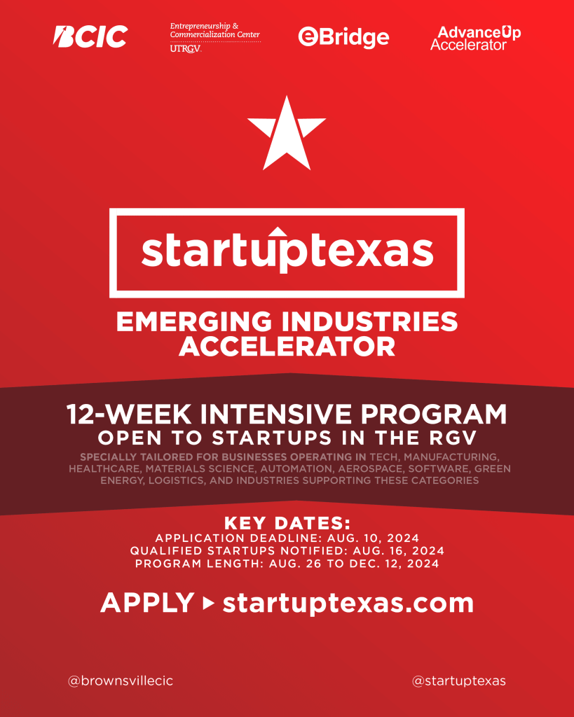 BROWNSVILLE, TEXAS – July 1st, 2024 — The Brownsville Community Improvement Corporation (BCIC) is accepting applications for a new cohort for the StartUp Texas Emerging Industries Accelerator Program. This 12-week intensive program will start in August 2024 and is designed to equip innovative startups throughout the Rio Grande Valley with the necessary tools for growth. The program focuses on fostering forward-thinking solutions in various sectors such as technology, manufacturing, healthcare, aerospace, and green energy.