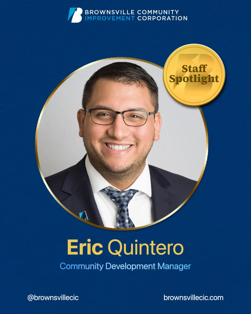 Eric Quintero has recently transitioned from a successful career in banking to taking on the role of Community Development Manager at the Brownsville Community Improvement Corporation (BCIC). His background in financial services and deep-rooted passion for his hometown have equipped him with a unique perspective on enhancing Brownsville’s economic landscape.
