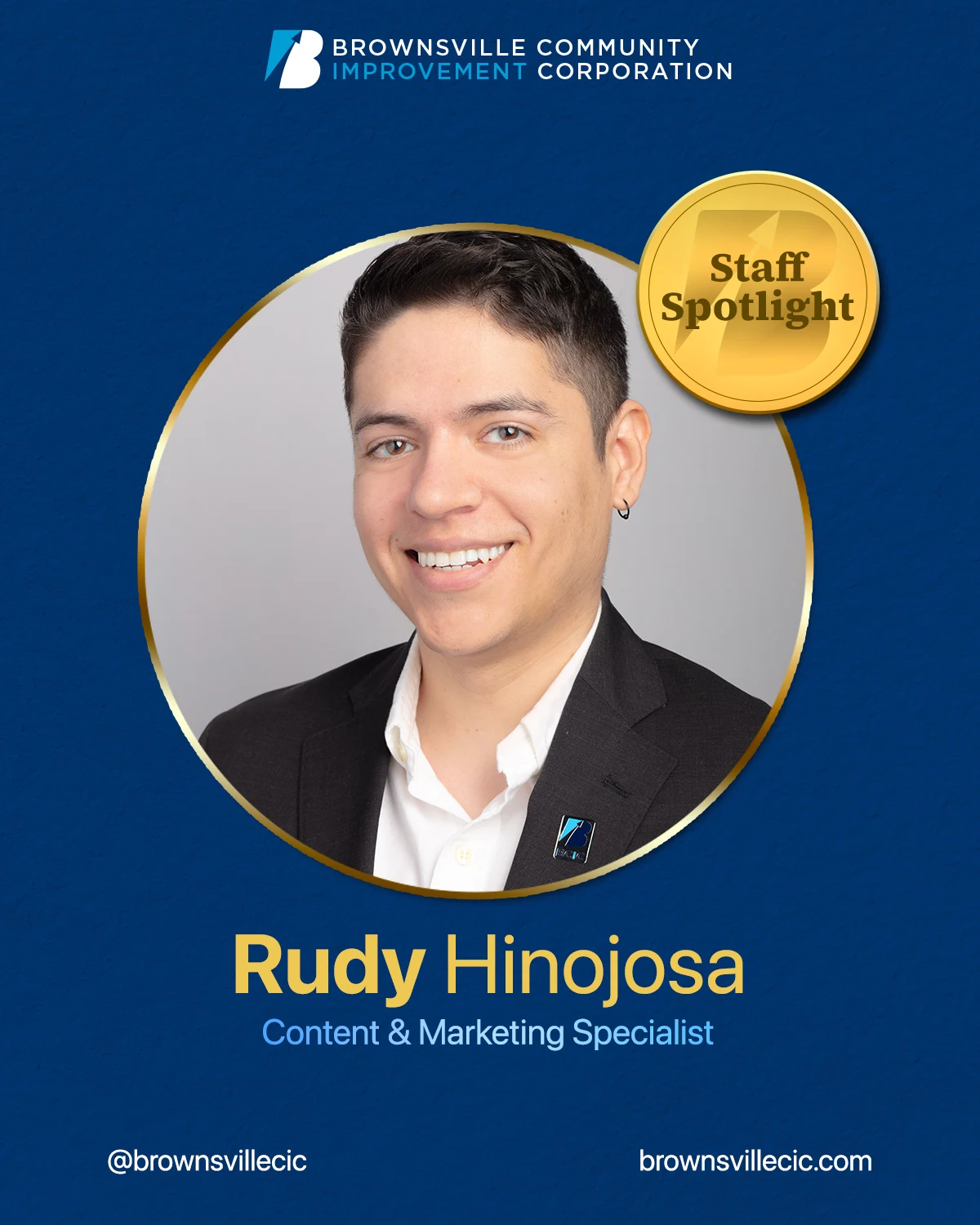 Meet Rudy Hinojosa, BCIC’s Content & Marketing Specialist—a storyteller at heart and a firm believer in the power of clear, engaging communication. Rudy’s work is all about making economic development accessible and exciting for everyone. Whether he’s capturing the city’s transformation through a camera lens, strategizing impactful campaigns, or drawing inspiration from his love of data and cultural preservation, Rudy is passionate about ensuring that Brownsville’s progress is understood and celebrated.