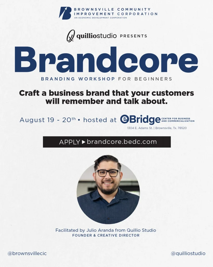 BROWNSVILLE, TX – June 22, 2023 – The eBridge Center, Brownsville’s community hub for business growth and innovation, is hosting the first edition of Brandcore™ – a foundational business branding workshop. This dynamic and free workshop is specifically tailored for local small business owners and entrepreneurs, particularly those new to branding. The two-day workshop provides participants hands-on experience and knowledge to create a powerful and unique brand or enhance their current one.