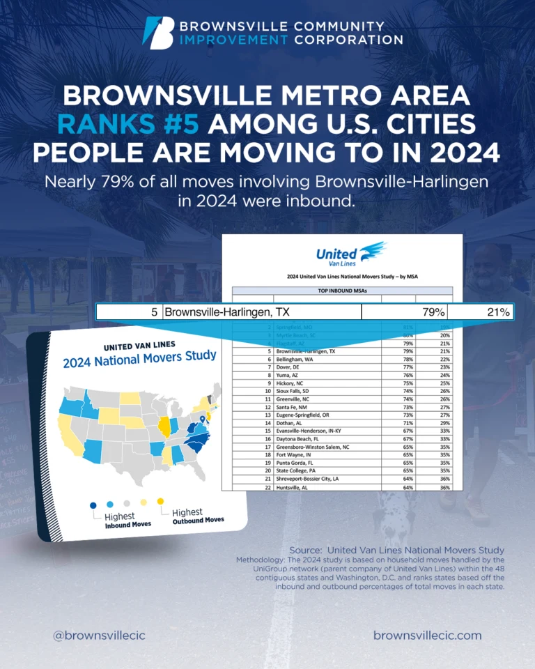 The Brownsville-Harlingen metro area has been ranked No. 5 in the nation for inbound moves in the 2024 United Van Lines National Movers Study.