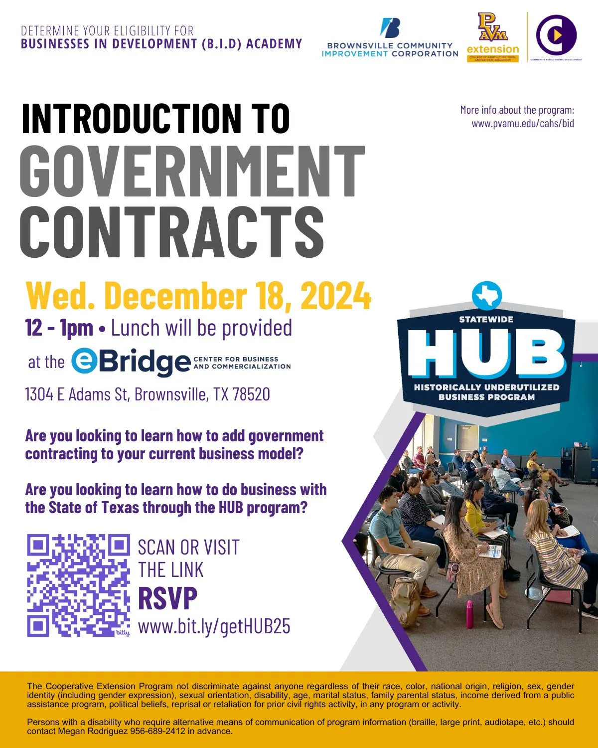 The Brownsville Community Improvement Corporation (BCIC), in partnership with Prairie View A&M University Cooperative Extension, will host an “Introduction to Government Contracts” workshop. This event is designed to help businesses learn how to add government contracting to their current business model and navigate the State of Texas Historically Underutilized Business (HUB) program.