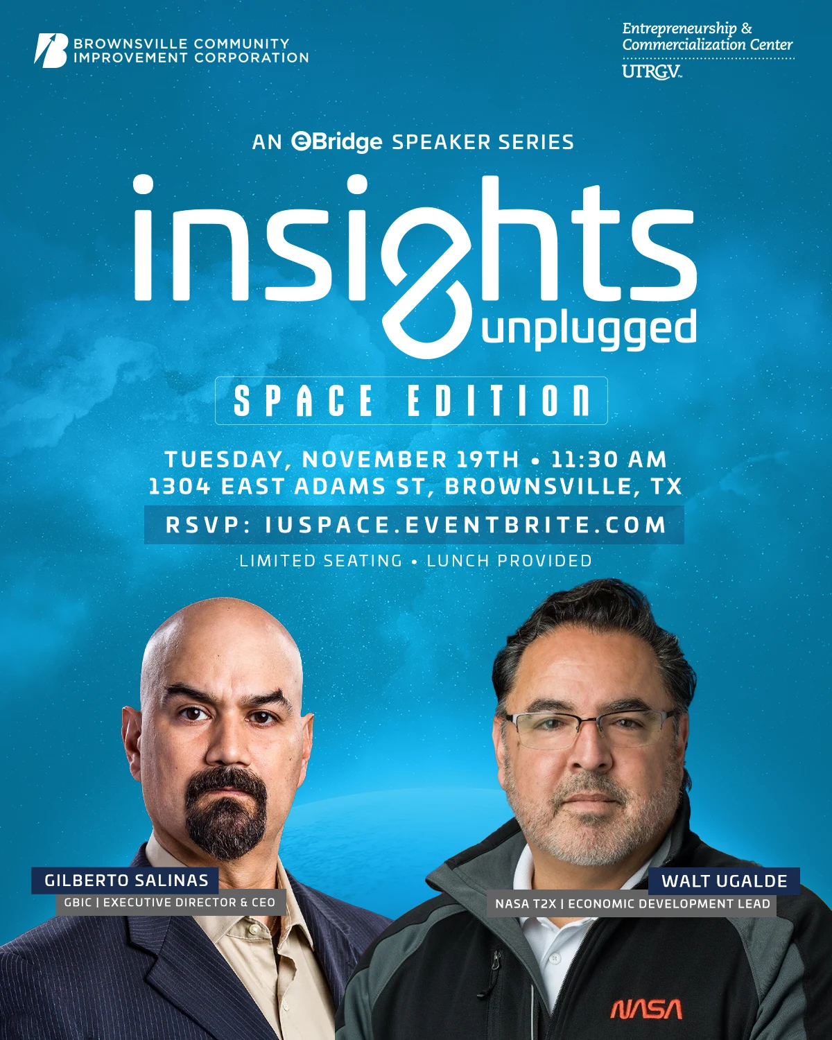 El Brownsville Community Improvement Corporation (BCIC) and University of Texas Rio Grande Valley Entrepreneurship and Commercialization Center announce a gathering of space industry leaders for “Insights Unplugged: Space Edition” on Tuesday, November 19, from 11:30 AM to 1:30 PM at the eBridge Center for Business & Commercialization.