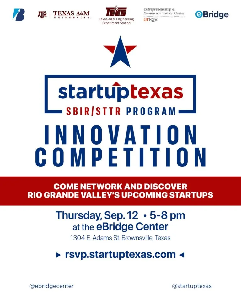 The StartUp Texas SBIR/STTR Innovation Competition will take place on Thursday, September 12, 2024, from 5:00 PM to 8:00 PM at the eBridge Center, located at 1304 E. Adams St., Brownsville, Texas. This event is free and open to the public, offering a unique opportunity to network with innovative entrepreneurs, business leaders, and community members. Attendees will also get the chance to witness the future of the RGV’s startup ecosystem and the most innovative ideas shaping the region.