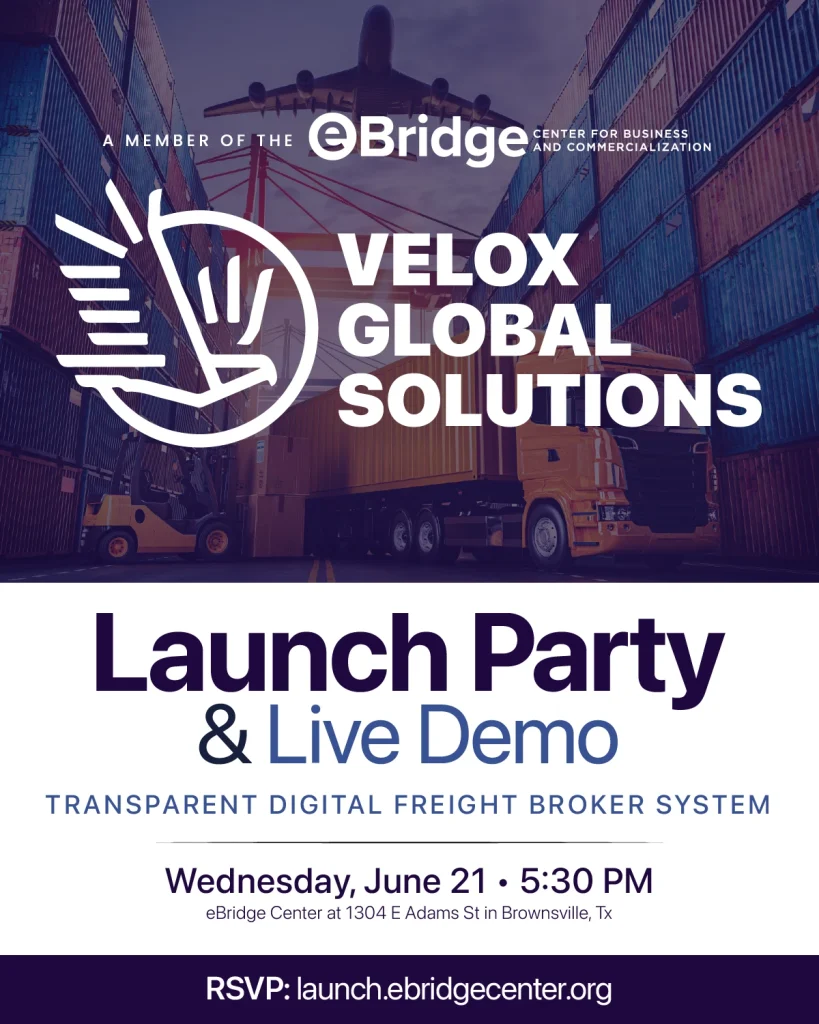 BROWNSVILLE, Texas – Monday, June 12, 2023 – Velox Global Solutions LLC, an active member of the eBridge Center for Business and Commercialization, announces its launch party on Wednesday, June 21 at 5:30 pm at the eBridge Center at 1304 E Adams St. This event will serve as a platform for Velox to introduce its ground-breaking digital freight broker system to the world, complete with a live demonstration.